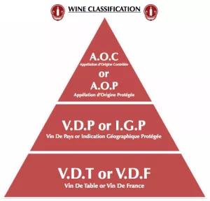 ▲ 法國(guó)葡萄酒等級(jí),位于金字塔頂尖的是A.O.C級(jí)別,最低端的級(jí)別為餐酒(V.D.T)