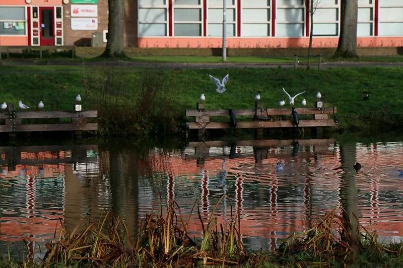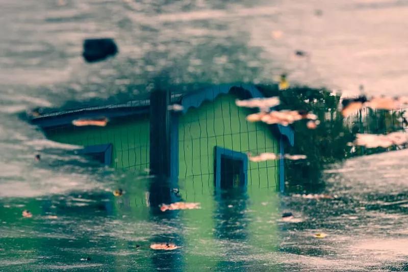 不平靜的水面會(huì)產(chǎn)生波紋,導(dǎo)致倒影的形狀發(fā)生變化。你可以利用這些產(chǎn)生變形的景物和實(shí)體進(jìn)行對(duì)比,比如說(shuō),水中扭曲的建筑物倒影: