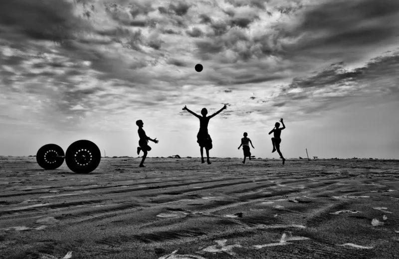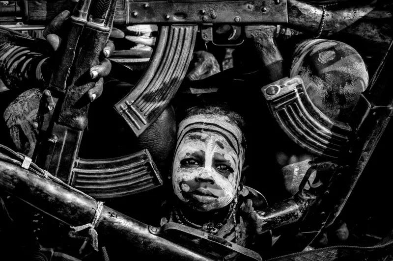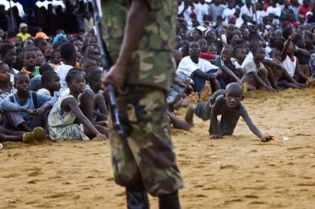 當(dāng)他把鏡頭對準(zhǔn)其中一名士兵的時候,在圍觀的人群中突然間鉆出來一個小男孩,試圖撿回他掉出去的球。利比里亞經(jīng)歷了多年的內(nèi)戰(zhàn),這個小男孩在戰(zhàn)爭中長大,他本能地害怕士兵和他們手中的槍。他想要把自己寶貴的球撿回來,然而他的眼睛卻一直緊緊盯著前面的士兵。