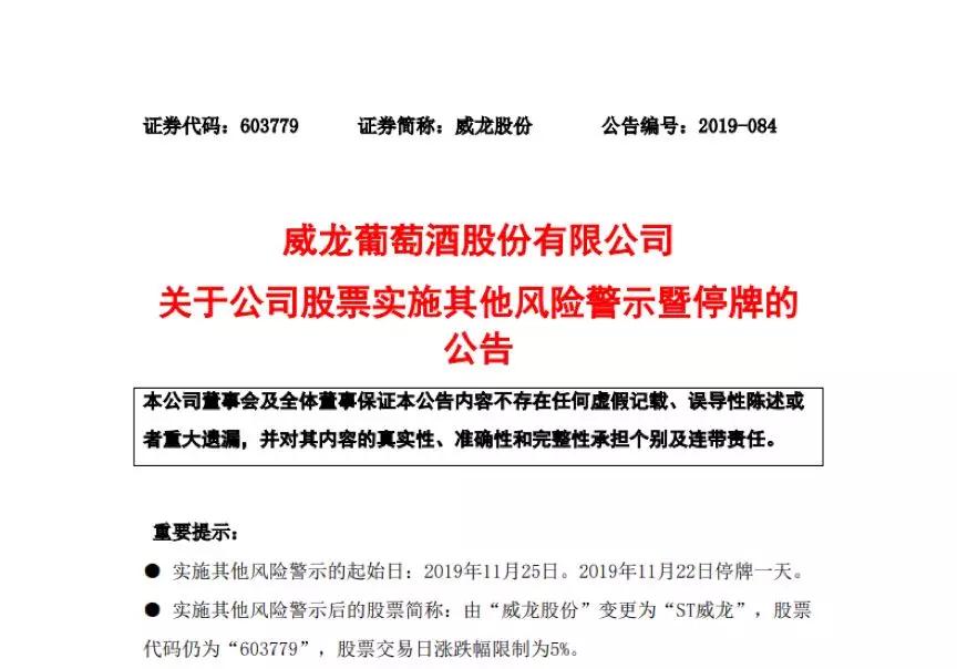 威龍股份發(fā)布公告稱,公司控股股東、實際控制人、董事長王珍海擅自以上市公司名義對外提供擔保,公司股票實施其他風險警示,2019年11月22日停牌一天。股票簡稱由“威龍股份”變更為“ST威龍”,股票代碼仍為“603779”,股票交易日漲跌幅也從10%限制為5%。