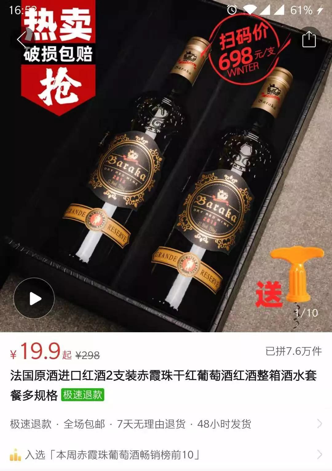 主打“下沉”市場(chǎng)的拼夕夕,“葡萄酒”品類(lèi)熱銷(xiāo)7.5萬(wàn)件的是19.9元2瓶還送皮盒的灌裝酒。但凡有葡萄酒常識(shí)的消費(fèi)者都能想到,除掉包裝、物流、人工,還能有毛利,得是多么劣質(zhì)的酒液,才能做出不到10塊錢(qián)的售價(jià)。