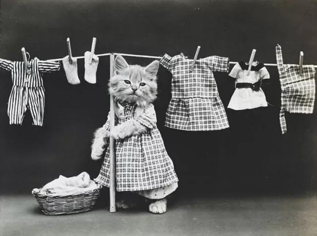 請大家放心,據(jù)當時媒體報道,貓咪穿的衣服都是弗里斯母親縫制的,外表看起來是普通的衣服,內部其實是和背景布相連的小口袋。還有一些小道具可以將貓咪的動作固定。