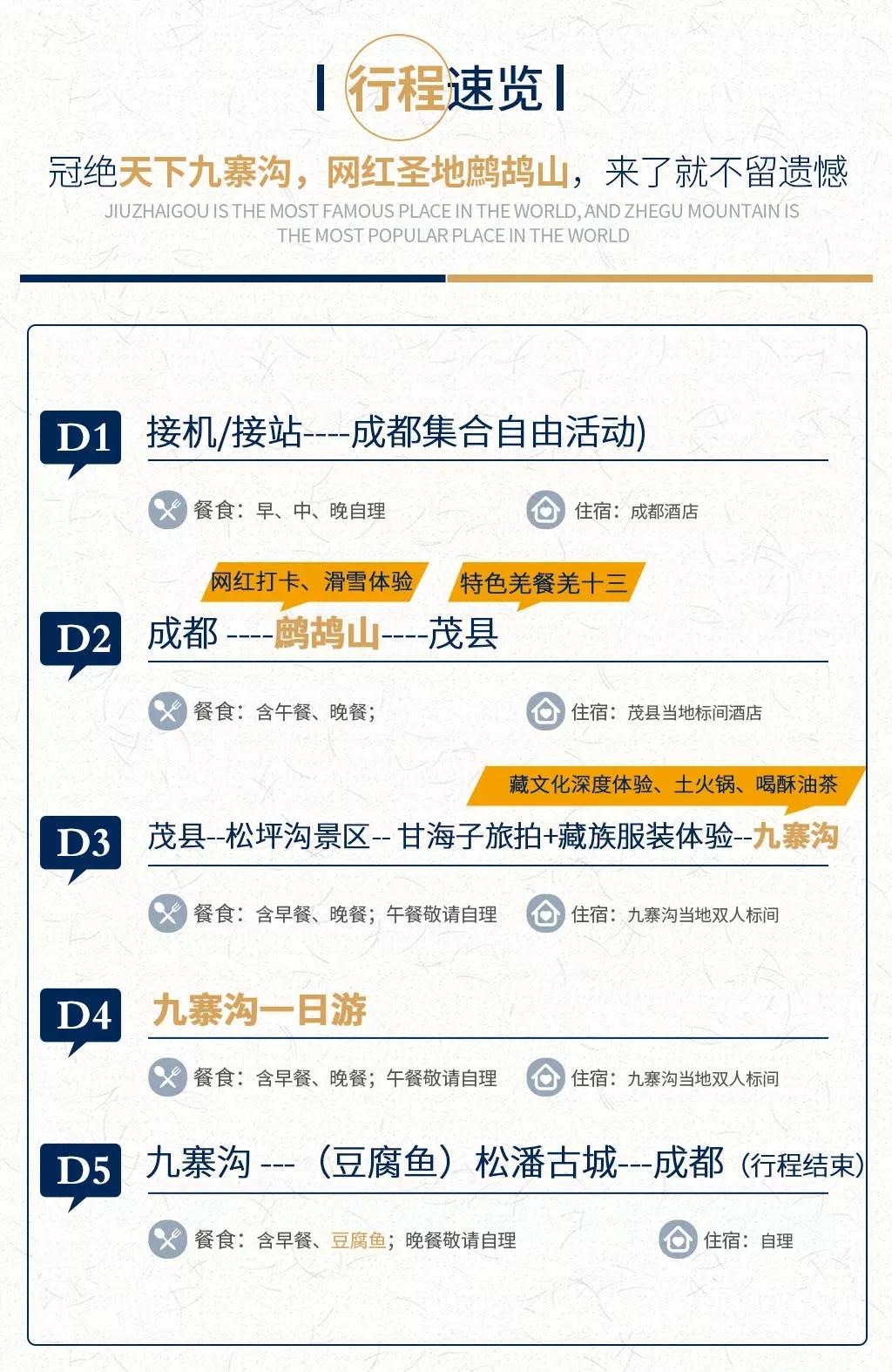 3、住宿:含全程4晚住宿,尊享價(jià)入住1晚成都當(dāng)?shù)鼐频辍?晚茂縣當(dāng)?shù)鼐频辍?晚九寨溝準(zhǔn)五溫泉酒店;舒適價(jià)入住1晚成都當(dāng)?shù)鼐频辍?晚茂縣當(dāng)?shù)鼐频辍?晚九寨溝準(zhǔn)四酒店;