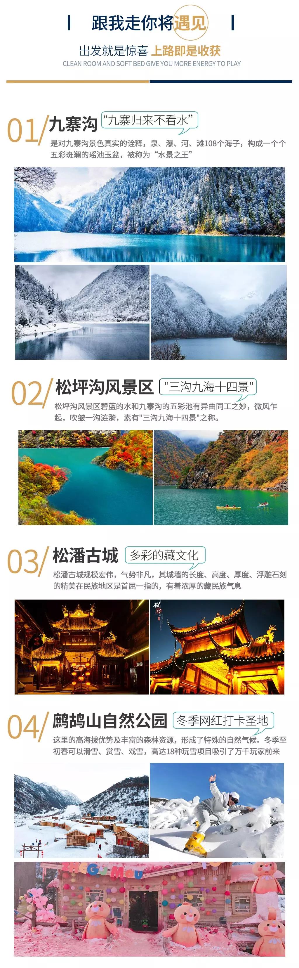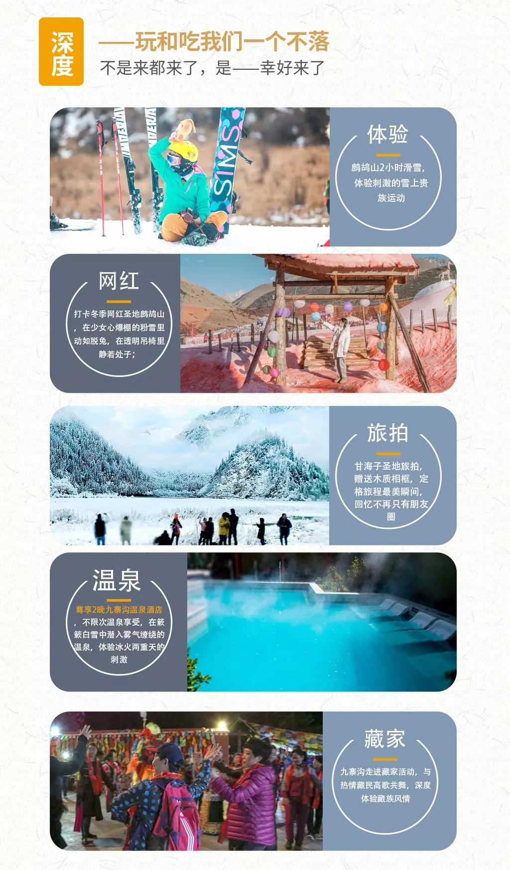 2、2晚九寨溝溫泉酒店(不限次數(shù)溫泉享受)、鷓鴣山2小時(shí)滑雪體驗(yàn)、甘海子圣地旅拍;