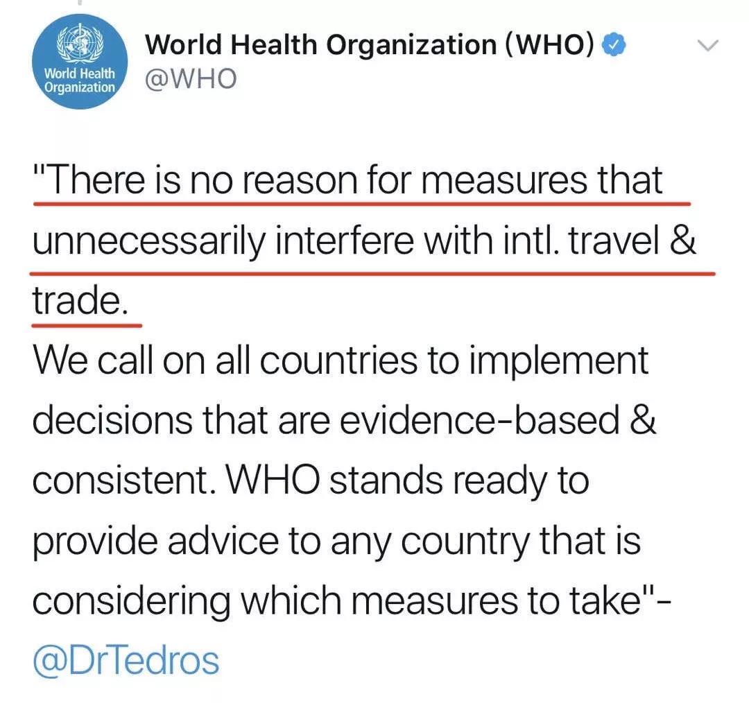 他強調(diào),目前各國“沒有任何理由采取不必要的限制旅游和貿(mào)易的措施”。