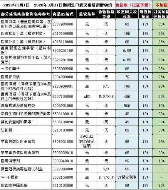 5、進口且原產(chǎn)于美國的物資,不實施對美加征關稅措施,已加征稅款予以退還(2020.1.1-2020.3.31)。簡而言之,就是海關不僅為疫情物資開放綠色清關通道,還免所有進口稅費(企業(yè)自用或用于銷售的防護物資不適用“捐贈物資”監(jiān)管方式,依然要繳納相關稅費)。