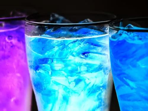 八、活斯布魯:15mL青檸果汁、25mL橙味利口酒、25mL金酒。先用藍色橙味利口酒沾濕古典杯杯口,將杯口沾滿糖粉,杯內(nèi)放入3塊冰塊,之后將配方中所給材料搖妥后濾入杯中。