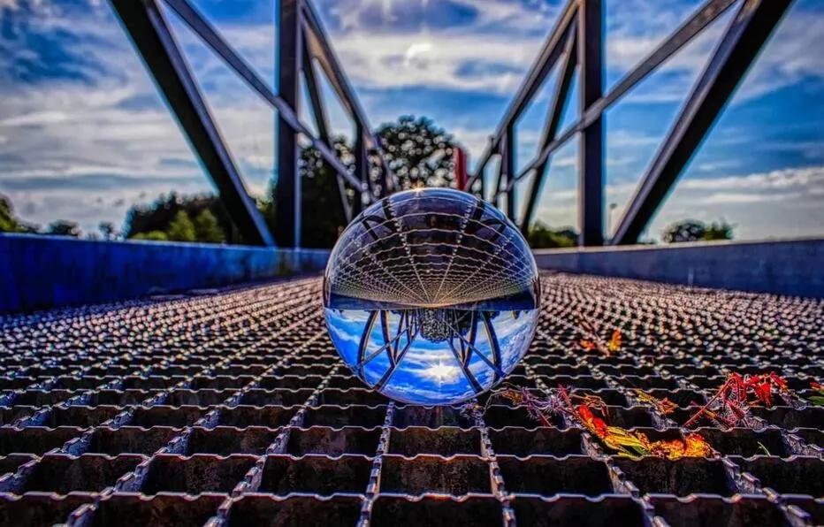最后這張照片是利用了一個(gè)水晶球,通過(guò)了低角度拍攝有線條,有節(jié)奏的鋼鐵結(jié)構(gòu)。我們就在一些場(chǎng)景中,用水晶球去營(yíng)造一些特殊的效果,就不用后期做這個(gè)效果了。