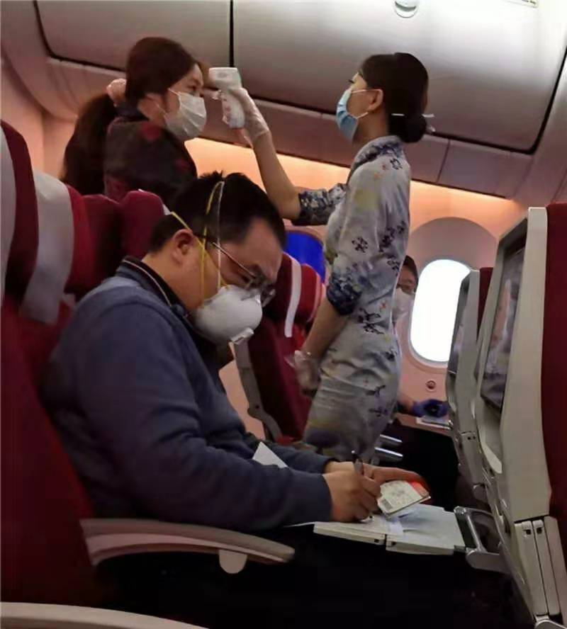 2月1日,在海南航空公司的國際航班上,機(jī)組人員向旅客發(fā)放健康申報表,并進(jìn)行必要的健康檢測和消毒。中國民航嚴(yán)格有序的措施,確保國際間人員往來和目的地國家的健康安全。
