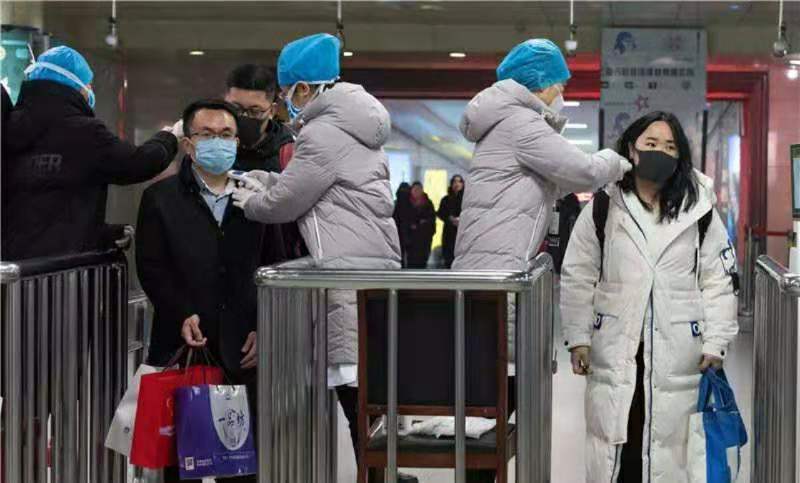 1月23日,山東濰坊火車站。為了防控新型冠狀病毒感染的肺炎,工作人員正在對出站的旅客逐一測體溫。