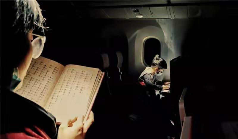 1月25日,由重慶起飛的航班上,兒子戴著口罩做作業(yè)。
