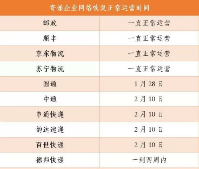 快遞公司全面復(fù)工快遞公司全面復(fù)工,但在春節(jié)和疫情期間,中國郵政、順豐速運(yùn)、京東物流、蘇寧物流一直處于正常運(yùn)營的狀態(tài)。中通快遞、圓通快遞、申通快遞、韻達(dá)速遞以及百世快遞等企業(yè)將從2月10日(今天)陸續(xù)恢復(fù)到正常運(yùn)營模式。