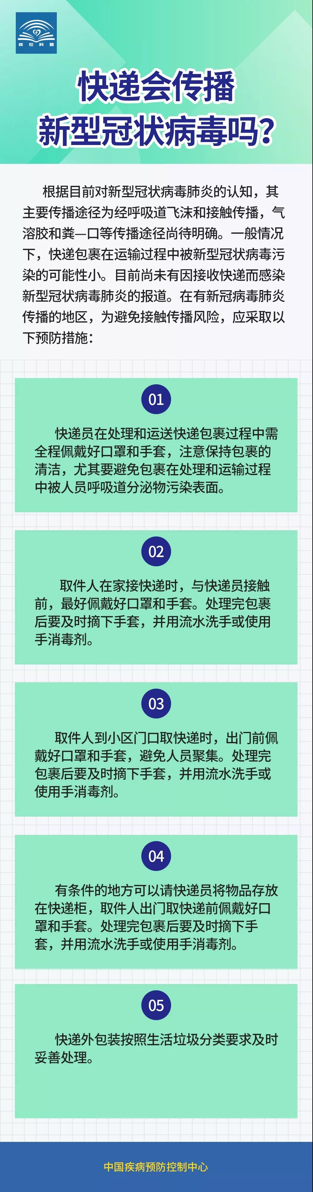 疫情之下,網(wǎng)上購物成為很多人獲取生活物資的首選方式,但也引發(fā)了一些擔(dān)憂,快遞會傳播新型冠狀病毒嗎?我們該如何更好地保護(hù)自己?中國疾控中心提示,快遞包裹在運(yùn)輸過程中被新型冠狀病毒污染的可能性小,目前尚未有因接收快遞而感染新冠肺炎的報道。