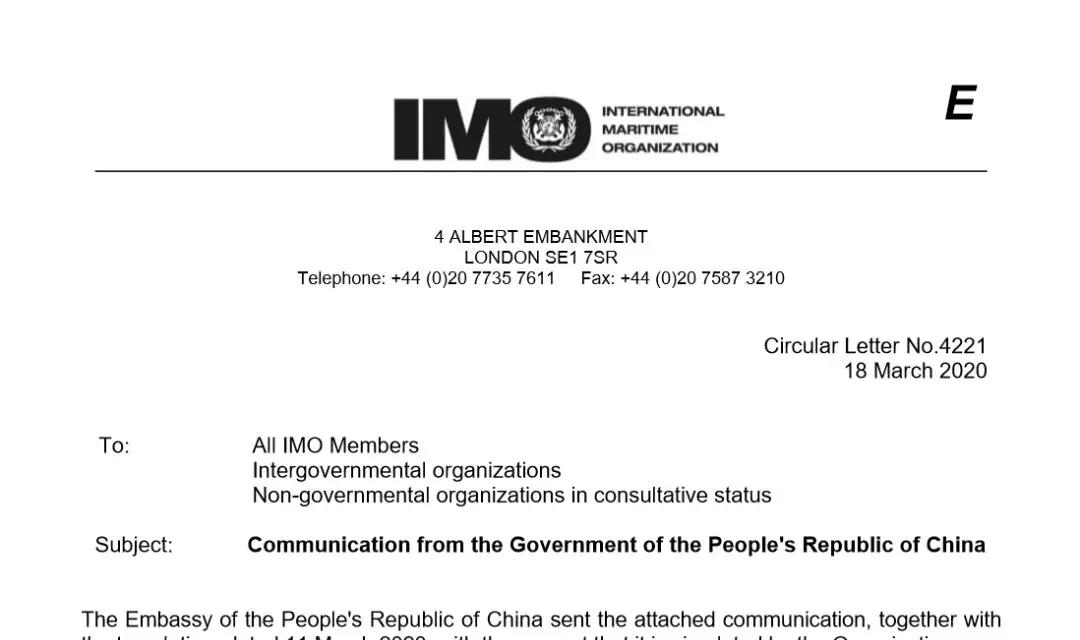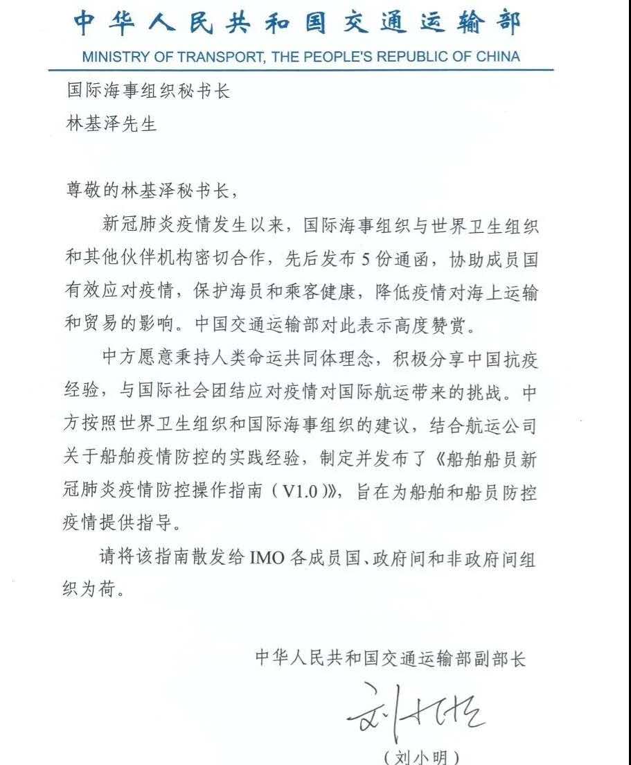 2020年3月18日,國(guó)際海事組織IMO發(fā)布Circular Letter No.4221,該通函件轉(zhuǎn)發(fā)了IMO秘書(shū)長(zhǎng)林基澤先生收到的中華人民共和國(guó)交通運(yùn)輸部劉小明副部長(zhǎng)3月11日發(fā)送的信函,信函后附《船舶船員新冠肺炎疫情防控操作指南(V1.0)》。IMO正式向174個(gè)成員國(guó)推薦由中國(guó)海事局編制的《船舶船員新冠肺炎疫情防控操作指南》,《指南》結(jié)合廣東海事局和航運(yùn)公司關(guān)于船舶疫情防控的實(shí)踐經(jīng)驗(yàn)制定,包括了船舶落實(shí)防控實(shí)施,加強(qiáng)船員個(gè)人防護(hù)等6個(gè)方面。