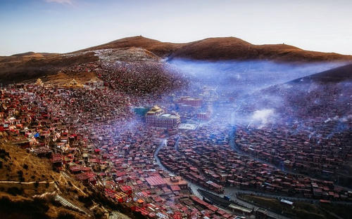 以佛學(xué)院的大經(jīng)堂為中心,密密麻麻搭滿了四面的山坡,