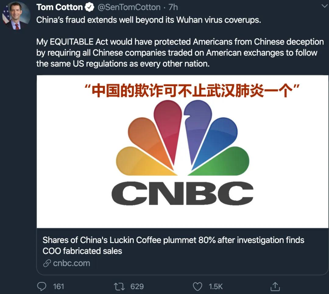 但是美國一個(gè)反華參議員囂張地轉(zhuǎn)載了瑞幸事件的新聞,配文說“中國的欺詐行為遠(yuǎn)不止武漢肺炎”。