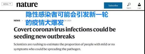 文中提出:無癥狀或癥狀輕微者可能占到所有新冠病毒感染者的60%,且傳播病毒的能力并不弱,這類隱性感染者可能會引發(fā)新一輪的疫情大爆發(fā)。