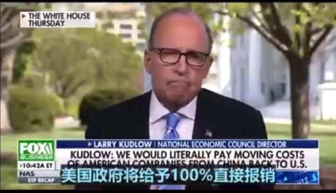 據(jù)“環(huán)球時報”綜合路透社、彭博社的報道,美國白宮的國家經(jīng)濟(jì)委員會主任拉里·庫德洛(Larry Kudlow)建議,通過“報銷全部費(fèi)用”的方式,吸引美國企業(yè)從中國遷回美國。