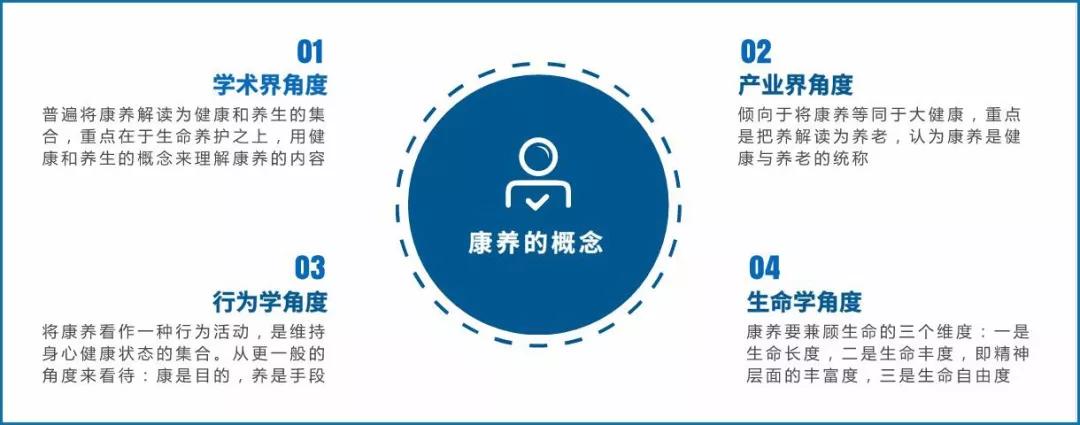 產(chǎn)業(yè)界角度:傾向于將康養(yǎng)等同于“大健康”,重點(diǎn)將“養(yǎng)”理解成“養(yǎng)老”。認(rèn)為“康養(yǎng)”是“健康”與“養(yǎng)老”的統(tǒng)稱。
