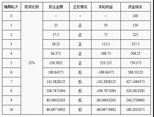 由此,我們根據(jù)凱利公式的計算而得投注比例,每次都拿出當(dāng)前手中資金的25%來進(jìn)行下注。設(shè)初始資金為100,硬幣為正面時收益為投注的2倍,為反面則失去投注金額。在下表中,我們模擬計算了10次賭局的收益情況。