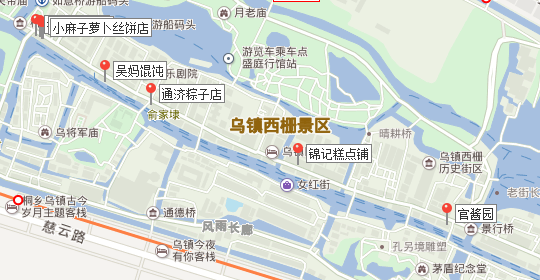 除了這些著名的餐廳之外,烏鎮(zhèn)的大部分特色糕點小吃也集中在西柵。比如擅長各式糕點的錦記糕點鋪、滋啦啦油煎鋪內(nèi)的小麻子蘿卜絲餅店、專做各式粉圓的沈記粉圓店等等。具體位置也都在下圖中標(biāo)注出來了(小麻子蘿卜絲餅店附近的小吃鋪子比較集中)。