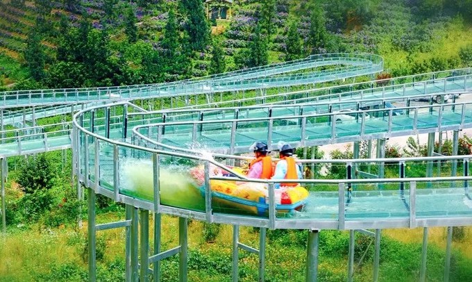 滑道全長1800米,滑道落差達100米。全程由高強度高透明玻璃建造,安全、驚險、刺激!讓您體驗高空呼嘯滑過的同時又能體驗駕馭飛舟激流沖浪的感覺。