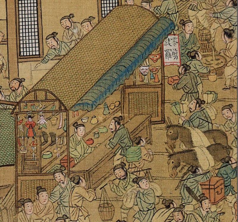 街道不僅空地上有攤販、街頭藝人表演、說書活動,連東京大相國寺內(nèi)也是萬姓交易,“近佛殿,孟家道院王道人蜜煎”,“兩廊皆諸寺師姑賣繡作、領(lǐng)抹、花朵……之類”,飛禽貓犬,珍奇玩好,無所不有。罷退下來的官員也擺地?cái)傎u帶不走的東西。甚至大內(nèi)也可以擺攤:“諸司人自賣飲食珍奇之物,市井之間未有也?!币虼髢?nèi)的特殊性,原本普通的商品也身價倍增,“凡飲食時新花果、魚蝦鱉蟹、鶉兔脯臘,金玉珍玩衣著,無非天下之奇……”