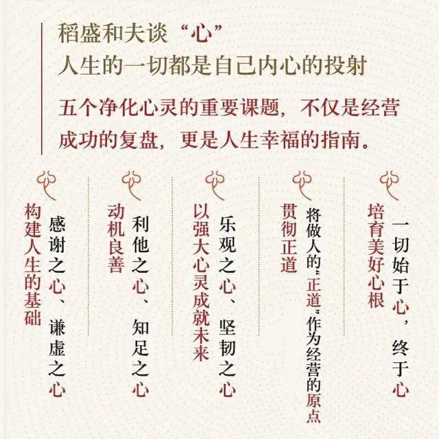 在長期的企業(yè)經(jīng)營中,稻盛和夫更是提出“提高心性,拓展經(jīng)營”的口號,貫徹“以心為本”的方針。