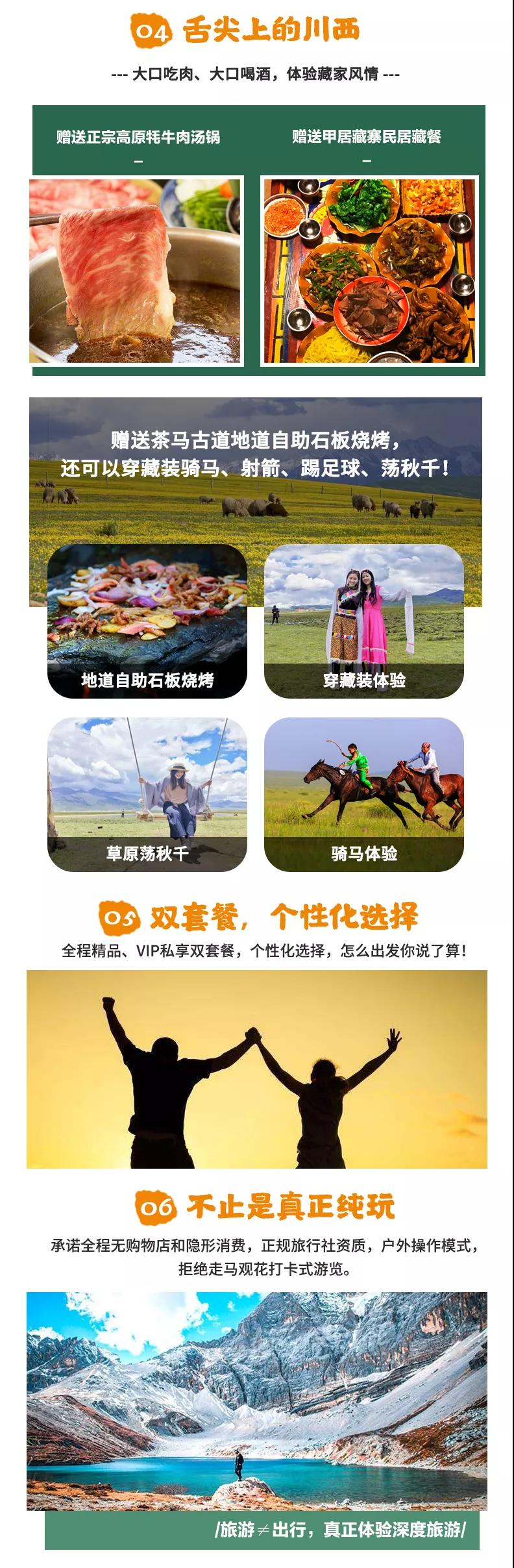 贈(zèng)送:特色贈(zèng)送甲居藏寨藏家晚餐、高原特色牦牛湯鍋、理塘茶馬古道自助石板燒烤;贈(zèng)送旅游三寶、魔術(shù)頭巾、礦泉水緩解旅途疲勞;贈(zèng)送價(jià)值98元圣地旅拍精致木質(zhì)相框&照片;贈(zèng)送稻城專業(yè)攝影師現(xiàn)場(chǎng)教學(xué)夜拍星空直出大片,沒(méi)有星星時(shí)則教拍流光大片;15人以上贈(zèng)送甲居藏寨篝火晚會(huì);贈(zèng)送成都市區(qū)24小時(shí)接機(jī)/接火車服務(wù);贈(zèng)送項(xiàng)目不用不退。