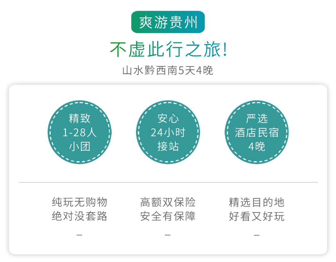 全天貴陽(yáng)集合,我們貼心贈(zèng)送24小時(shí)接機(jī)接站服務(wù)(貴陽(yáng)龍洞堡機(jī)場(chǎng)、貴陽(yáng)北站、貴陽(yáng)火車(chē)站)。若時(shí)間合適,可自愿參加我們贈(zèng)送項(xiàng)目--【老貴陽(yáng)City Walk 半日游】
