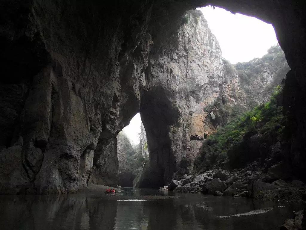 在這一段長約2公里的六沖河河道上,箱形切割頂板 多處塌陷,形成了多個(gè)形狀、大小各異的天窗、天坑,是已發(fā)現(xiàn)的天窗天坑最密集的溶洞群,是可供乘船游覽最高大的溶洞群。