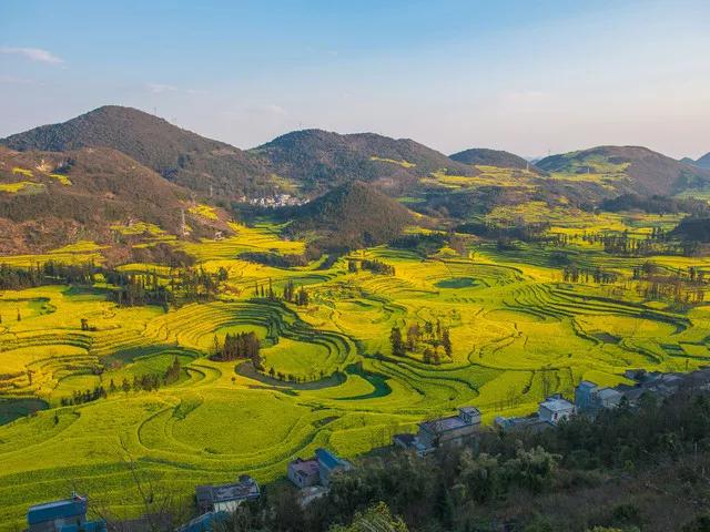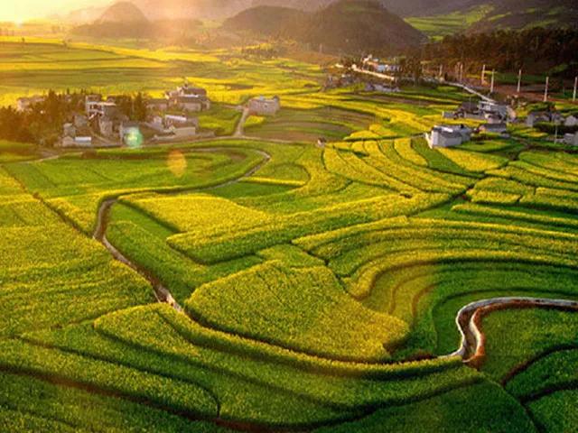 冬春季節(jié),長滿油菜花的地塊金光燦爛,長著小麥的地塊碧綠如玉;通過時(shí)候,沿著園周梯田一圈圈往上延伸的多是開滿油菜花的,像無數(shù)金龍盤臥。還有的弓形、半園形的梯田,多的十幾級、少的三四級,而且各種形狀相鑲,其間隔有一兩塊裝滿水的閑田如明鏡置于其中,一排排翠綠的樹點(diǎn)綴,形成了色彩鮮明、線條優(yōu)美、奇妙無比的美景。