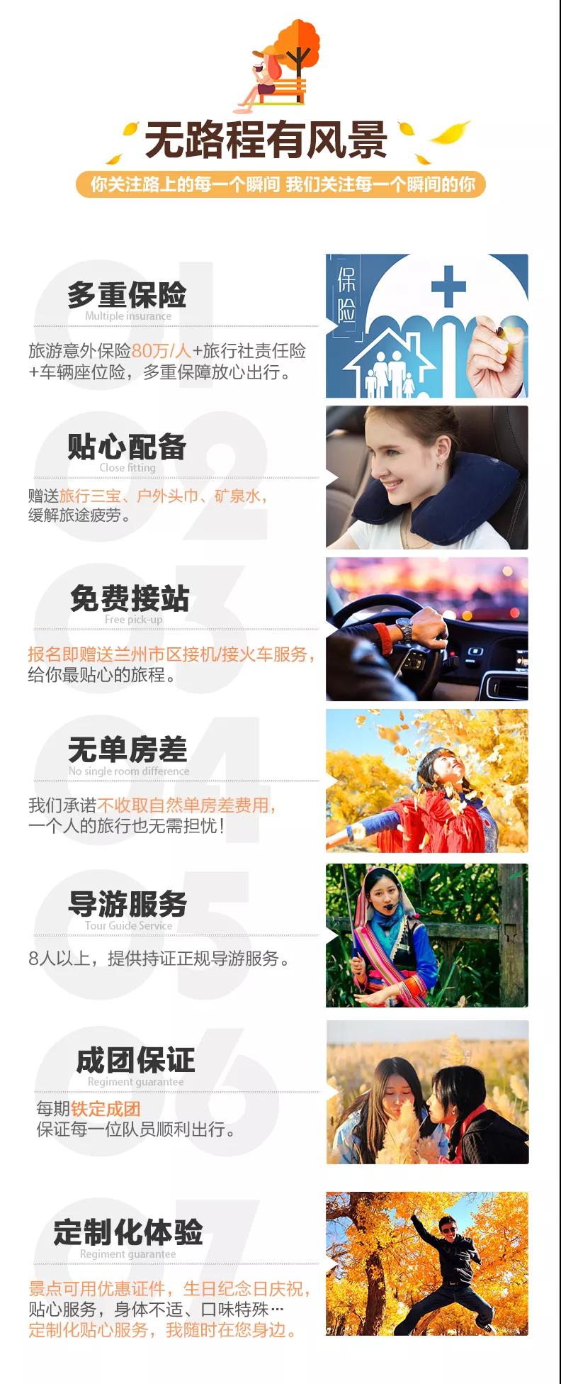 接站服務(wù):3人以下的客人抵達(dá)蘭州可自行打車前往指定酒店,打車費(fèi)用可報銷30元/人;3人及以上的客人抵達(dá)蘭州可提供蘭州市區(qū)拼車接機(jī)/接火車服務(wù),接機(jī)/接火車的工作人員會在您出發(fā)日期前一天21:30之前向您推送消息并與您聯(lián)系,如果超過時間沒有接到任何通知,請及時與導(dǎo)游或報名處聯(lián)系。(節(jié)假日用車人數(shù)較多情況下客人等待時間可能會延長;我方會安排臨近航班拼車接機(jī)接站,如遇其他客人航班火車延誤晚點(diǎn)情況,等待時間可能會延長,敬請諒解)