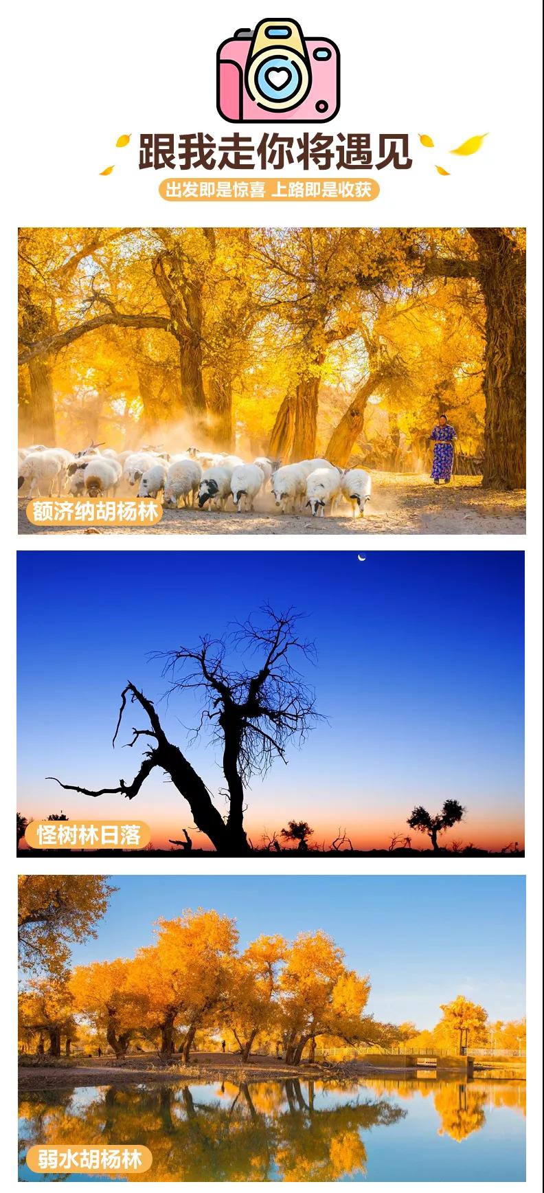 隨后我們在【額濟(jì)納胡楊林景區(qū)】中自行游玩攝影創(chuàng)作,胡楊有“生而一千年不死,死而一千年不倒,倒而一千年不朽”的說法,被世人稱為英雄樹。千姿百態(tài)的胡楊遍布在沙漠中,漫步輝煌的金秋胡楊林,用鏡頭記錄這中國最美的秋景;或者去找尋導(dǎo)游所說的一樹三葉的神奇景象——“幼樹葉如針?biāo)屏?、壯齡樹葉酷似白樺、老年樹葉橢圓”,胡楊、藍(lán)天、來自大漠腹地的風(fēng)聲襲來之時,胡楊林便泛起黃澄澄的層層漣漪,顯盡大西北秋冬那紅盛翠減的獨(dú)有風(fēng)情。張藝謀的大片《英雄》中張曼玉與章子怡身著紅衣在這漫天的金色胡楊中打斗,踱步在胡楊林,熒屏內(nèi)的唯美畫面一一浮現(xiàn)。
