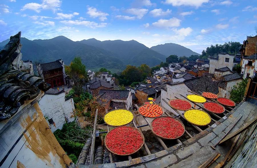 到了秋天在滿天的晴空下,卻多出了一道別樣的風(fēng)景——篁嶺曬秋。