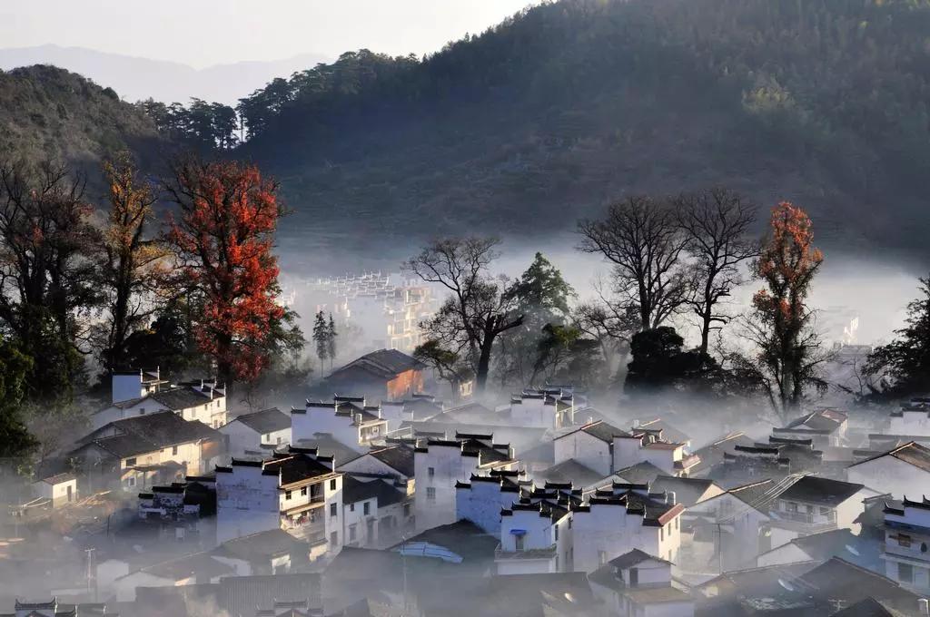塔川烏桕樹經(jīng)過霜降,由綠變黃,由黃變紅,漸變出調(diào)色板般豐富的色彩。塔川的清晨極美,薄薄的霧氣似有似無,籠罩在山腰,林間,農(nóng)家的小屋若隱若現(xiàn),紅楓叢中小露飛檐翹角,黃葉微隙掩映粉墻黛瓦,如中國山水畫般詩情畫意。