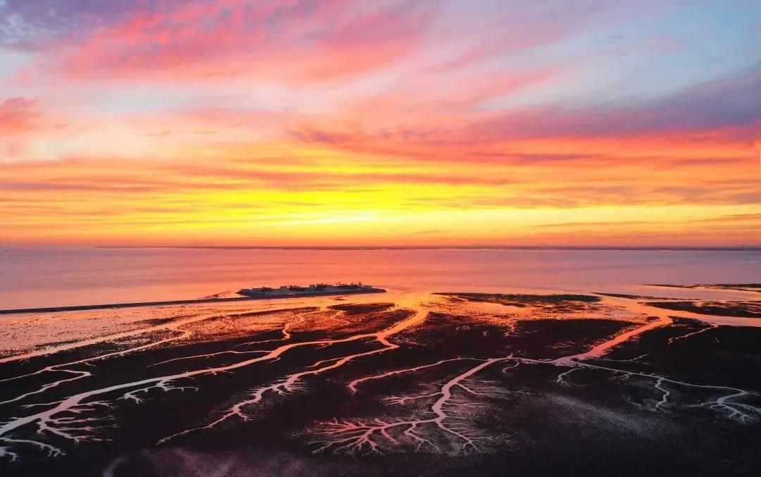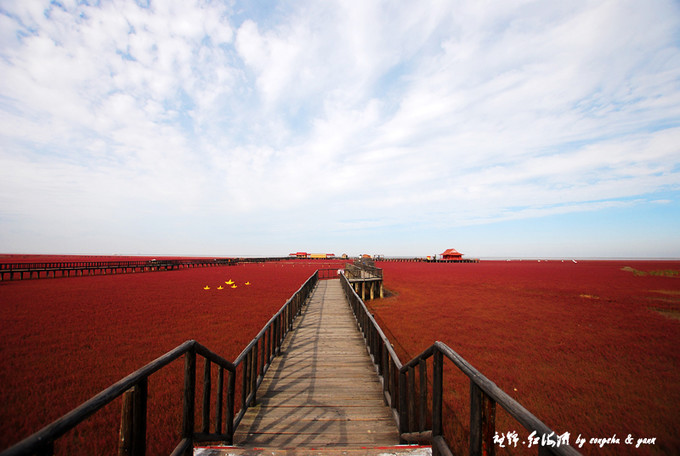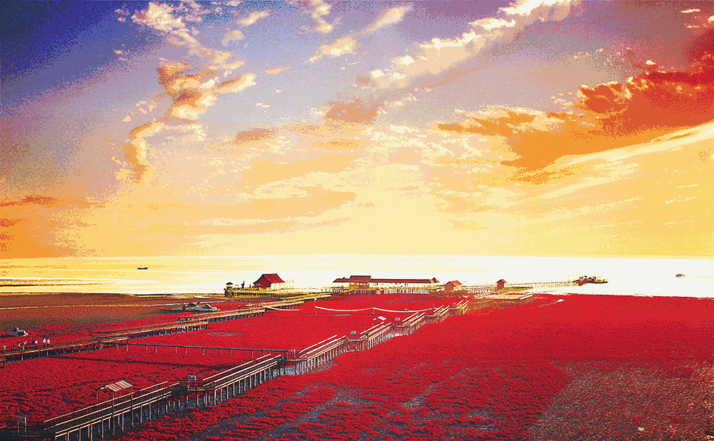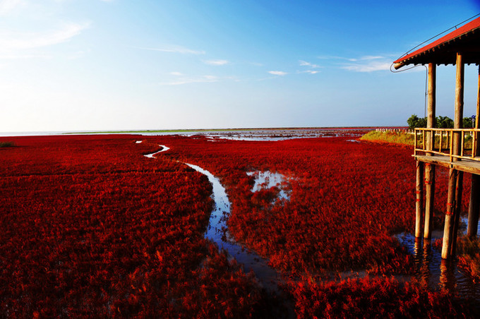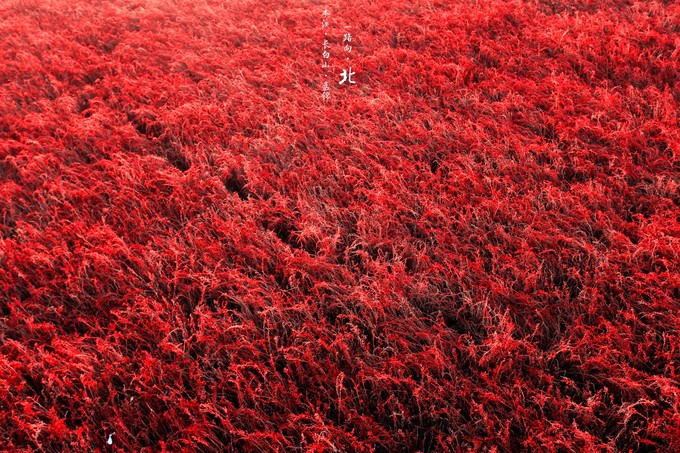 紅海灘位于遼寧省盤錦市渤海灣的東北部,地處遼河三角洲濕地內,是國家級自然保護區(qū)。這里的海灘之所以呈現出紅色,其實是因為海灘上生長堿蓬草是一種可以在鹽堿土質上存活的草。每年四月,堿蓬草長出地面,初為嫩紅,漸次轉深,秋季由紅變紫。堿蓬草不要撒種,無須耕耘,在鹽堿鹵漬里,年復一年地生長,造就了這一奇觀。盤錦的紅海灘每年以50米的速度向大海延伸,始終追趕著海浪的蹤跡。