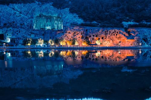 龍門石窟位于河南省洛陽市區(qū)南面12公里處,是一個風景秀麗的地方,這里有東、西兩座青山對峙,伊水緩緩北流。遠遠望去,猶如一座天然門闕,所以古稱“伊闕”。自古以來,為游龍門的第一景觀。