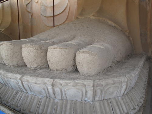 甘谷大佛石窟造象可遠溯至北魏,具體年代已經無從稽考。現(xiàn)存釋迦牟尼大佛像始鑿于北魏,一直到盛唐才趨完美。大佛石胎泥塑,身高23.3米,腰闊10.4米,結跏跌坐于蓮座之上,高大魁梧,溫順善良,坐于30.2米高、窟頂呈圓拱形的石窟內,頤面豐滿,肉髻高突,兩耳下垂,頸短并飾三道弦紋,短須作蝌蚪狀,施拔濟眾生印,足踩豐蓮??邇冗€殘存懸塑達摩、頻伽、飛天、卷云、蓮葉等,栩栩如生。