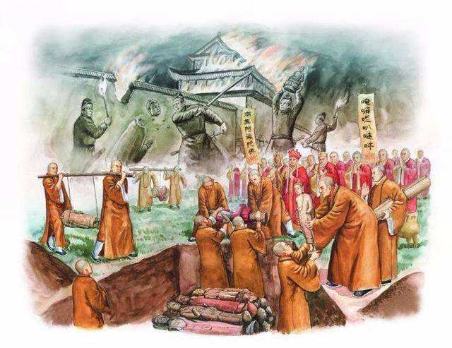 然而,僧尼還俗還不足以泄皇帝心中對佛教之惡,他們甚至向僧眾們舉起了屠刀。魏太武帝的措施是最為殘暴的,他采用“沙門無少長,悉坑之” 的方法來打擊佛教徒。幸運的是虔信佛教的太子拓跋晃時為留守平城的監(jiān)國,他利用秉政之機,有意緩宣太武帝的滅佛詔書,使遠(yuǎn)近各地的僧侶得到消息后亡匿免死。但這只能是平城地區(qū)僧侶的幸運,其他地區(qū)的僧侶卻在劫難逃。《南齊書》卷五十七《魏虜傳》記載:“初,佛貍討羯胡于長安,殺道人且盡。”《高僧傳》卷十《曇始傳》也載:“以偽太平七年,遂毀滅佛法,分遣軍兵,燒掠寺舍,統(tǒng)內(nèi)僧尼悉令罷道,其有竄逸者,皆遣人追捕,得必梟斬。一境之內(nèi),無復(fù)沙門?!北蔽禾涞凵踔吝B為僧尼提供避難之所的俗人也不放過。據(jù)《魏書·世祖紀(jì)》稱:“自王公以下至于庶人,有私養(yǎng)沙門……在其家者,皆遣詣官曹,不得容匿。限今年二月十五日,過期不出,師巫、沙門身死,主人門誅。”唐武宗也下令,如有僧尼不伏還俗者,科違敕罪,當(dāng)時決殺。會昌三年(843年)四月中旬,武宗令殺天下摹尼師,將剃發(fā)及著袈裟作沙門形殺之。由此可見,措施是嚴(yán)厲的,手段是殘暴的。但太武帝卻以滅佛是“除偽定真,復(fù)羲農(nóng)之治”,乃“有非常之人,然后能行非常之事” 而津津樂道。