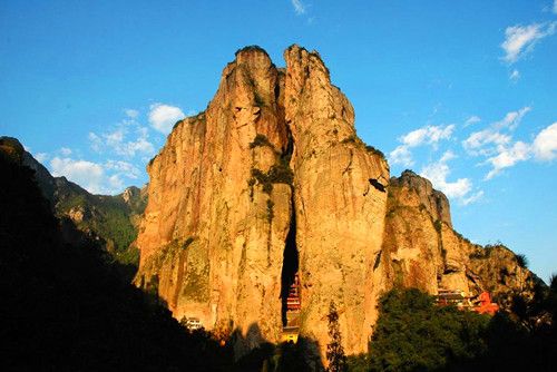 靈峰是雁蕩山的東大門。東來的游客一抬頭就能看到蒲溪西邊那叫做接客僧的巨巖,接客僧是雁蕩山中形象最為逼真生動同時(shí)也最具象征意味的肖物擬人景點(diǎn),它把我們導(dǎo)入一種佛教的氛圍,這種氛圍在危樓九疊的觀音洞里達(dá)到了頂點(diǎn)。靈峰四周諸多青峰蒼崖迂回盤旋,繞出一方如夢如幻的勝景。剪刀峰又最會做態(tài),“移步換形”,尤其在月夜,真真幻幻的山景會令人生出許多遐想。“雁蕩冠天下,靈巖尤絕奇?!膘`巖被視為雁蕩山的“明庭”。