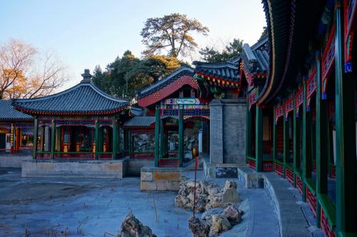 仁壽殿后是三座大型四合院:樂壽堂、玉瀾堂和宜蕓館,分別為慈禧、光緒和后妃們居住的地方。宜蕓館東側的德和園大戲樓是清代三大戲樓之一。頤和園自萬壽山頂?shù)闹腔酆O蛳?,由佛香閣、德輝殿、排云殿、排云門、云輝玉宇坊,構成了一條層次分明的中軸線。