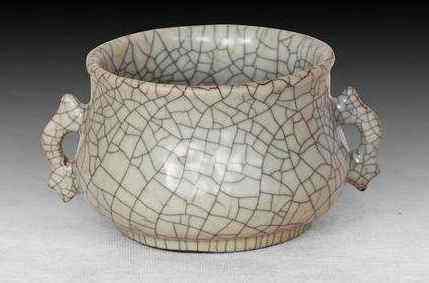 哥窯釉質(zhì)純粹濃厚,不甚瑩澈,釉內(nèi)多有氣泡,如珠隱現(xiàn),故通稱“聚沫攢珠”。釉色寶光內(nèi)蘊(yùn),潤澤如酥。紋片多種多樣,以紋道而稱之有鱔魚紋、黑藍(lán)紋、淺黃紋、魚子紋;以紋形而稱之有綱形紋、梅花紋、細(xì)碎紋、大小格紋、冰裂紋等,總名為百極碎。哥窯器物傳世的以各式瓶、爐、洗、盤、碗、罐為常見。但哥窯窯址仍未確認(rèn),成為中國陶瓷史上的懸案之一。