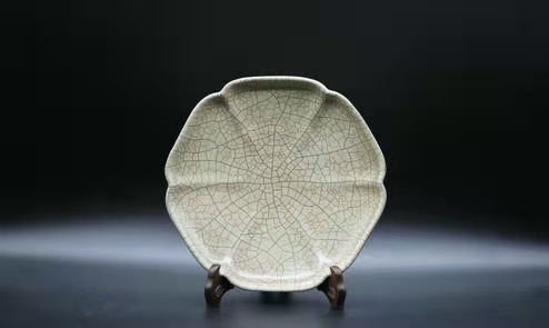 發(fā)生損壞的宋代哥窯青釉葵瓣口盤呈六瓣葵花式,通體施青灰色釉,釉面開細(xì)碎片紋。圈足露胎處呈黑褐色。此盤造型優(yōu)雅、大方;線條富于變化,為宋代哥窯的代表作品。