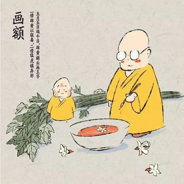 端午節(jié)時以雄黃涂抹小兒額頭的習俗,云可驅(qū)避毒蟲。典型的方法是用雄黃酒在小兒額頭畫“王”字,一借雄黃以驅(qū)毒,二借猛虎(“王”似虎的額紋,又虎為獸中之王,因以代虎)以鎮(zhèn)邪。除在額頭、鼻耳涂抹外,亦可涂抹他處,用意一致。山西《河曲縣志》云:“端午,飲雄黃酒,用涂小兒額及兩手、足心,……謂可卻病延年?!?