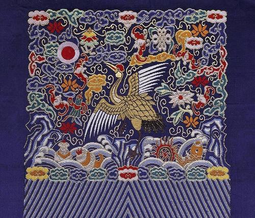 云錦是專為帝王將相、王妃公主們做服飾的,有著鮮明的宮廷文化的烙印。君權神授是封建君主專制制度的一種政治理論。歷代帝王自命“真龍?zhí)熳印?,受命于天,統(tǒng)治眾生。故而,皇帝的衣服藻飾華麗,服飾上大量使用神獸“龍”的形象。北京故宮博物院收藏的雍正皇帝云錦朝服,在石青色素緞地上,于前胸、后背、肩部織團花五爪正龍、腰圍行龍五,襞積前后團龍各九,裳正龍二,行龍四;披領行龍二,袖端正龍各一;通身五彩祥云,下八寶平水,海水江崖。龍袍上除表現(xiàn)惟我獨尊的天子尊位外,還隱喻著“一統(tǒng)山河”和“萬事升平”的寓意。文武官員的服飾則有著森嚴的等級差別,明代文武一般官服,按官品等級不同,顏色花紋各有區(qū)別。大官紅袍,中等青、綠袍,小官檀和褐綠袍?;ǘ湟卜执笮。」贌o花紋。更明顯的區(qū)別標志是補子,文禽武獸,胸背各一。