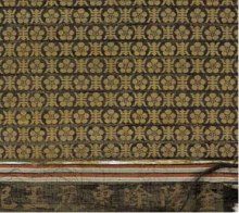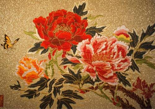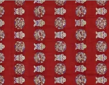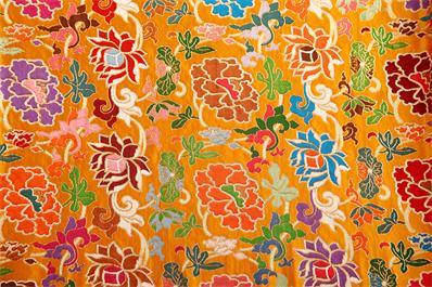 庫緞是在緞地上起本色花?;y有明花和暗花兩種。明花浮于表面。暗花平板不起花。庫錦,又名織金。其花紋全部用金線織出。傳統(tǒng)的織金圖案,大多采用小花紋,以充分顯金為其特色。