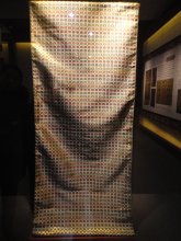 龍袍上17條龍使用了真金線和包裹了孔雀羽的絲線原料。真金線首先要把金塊制成金箔。兩人相對而坐,輪流舉錘,經(jīng)過3萬多下的錘打,把一塊厚重的黃金,變成輕如鴻毛的金箔,再把金箔粘在一種特殊紙張上,壓緊拋光,最后裁成條,剝出金線,和蠶絲相互纏繞,捻搓成金絲線。這件“孔雀羽織金妝花紗龍袍”復制品于1985年送展日本筑波科技世博會。