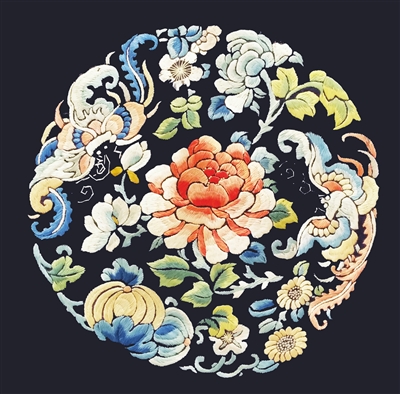 以上是團花紋樣在花紋組合上常用的幾種方法。團花紋樣的構成,在實際應用中并不止這幾種方法。如傳統(tǒng)紋樣中的“五福捧壽”團花,是用五只同形的蝙蝠,作向心的等份組合,中心安放以圓形的篆體“壽”字,組成一個完整的團紋。“八仙慶壽”團花,是用八件形狀各異的寶物,在圓形中作適合形的組合,中心安以篆體“壽”字組成?!笆率氯缫狻眻F花,是用一柄如意和兩只柿子,在圓光中作適合形的安排處理即成。此外,還有用一枝折枝花,或一只花籃作圓形的適合處理,外邊再加一圈規(guī)律性構成的花邊,組成一個完整的團紋。還有用八組同形同量的花紋,作向心的或放射狀的組合,也可組成一個完整的團紋。