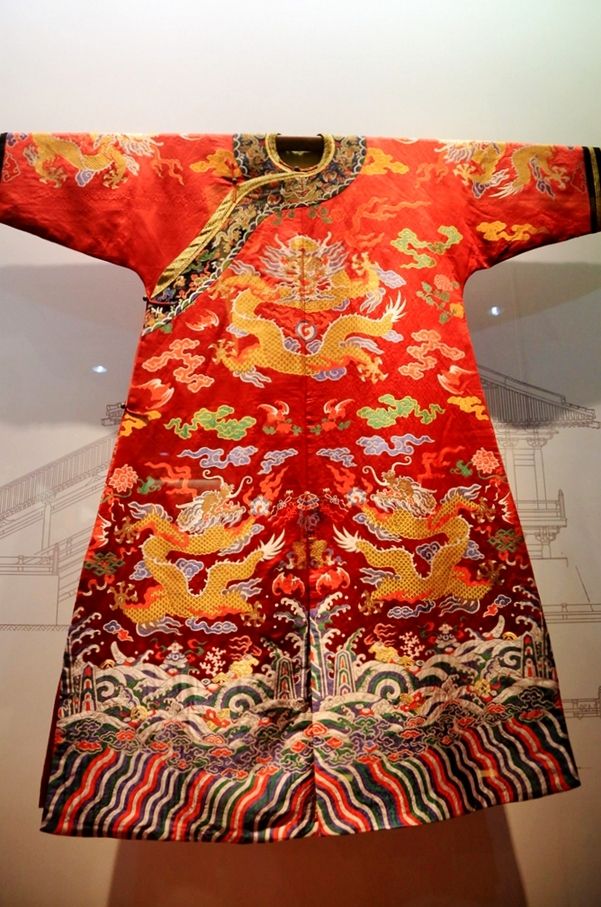 在中國傳統(tǒng)戲劇的舞臺上,凡有帝王將相、王妃公主出場,他們身上光彩奪目的服飾,總會讓人們的眼睛為之一亮。它們有力地烘托了人物,渲染了劇情氣氛。這些雍容華貴的戲劇服飾,是以明清帝王后妃和高官貴婦及千金們的服飾為藍本,經(jīng)過藝術加工制成的。而這些古代帝王們的服飾,其中許多就是用南京云錦縫制而成的。所以在“南京云錦”上也就打上了深深的“階級烙印”,帝王服飾體現(xiàn)了“王權神授”的觀念,歷代帝王自命“真龍?zhí)熳印?,受命于天,駕臨人世,統(tǒng)治眾生,于是在服飾上大量使用傳說中的神獸“龍”的形象,非帝王不準用,以示君臨天下,唯我獨尊。